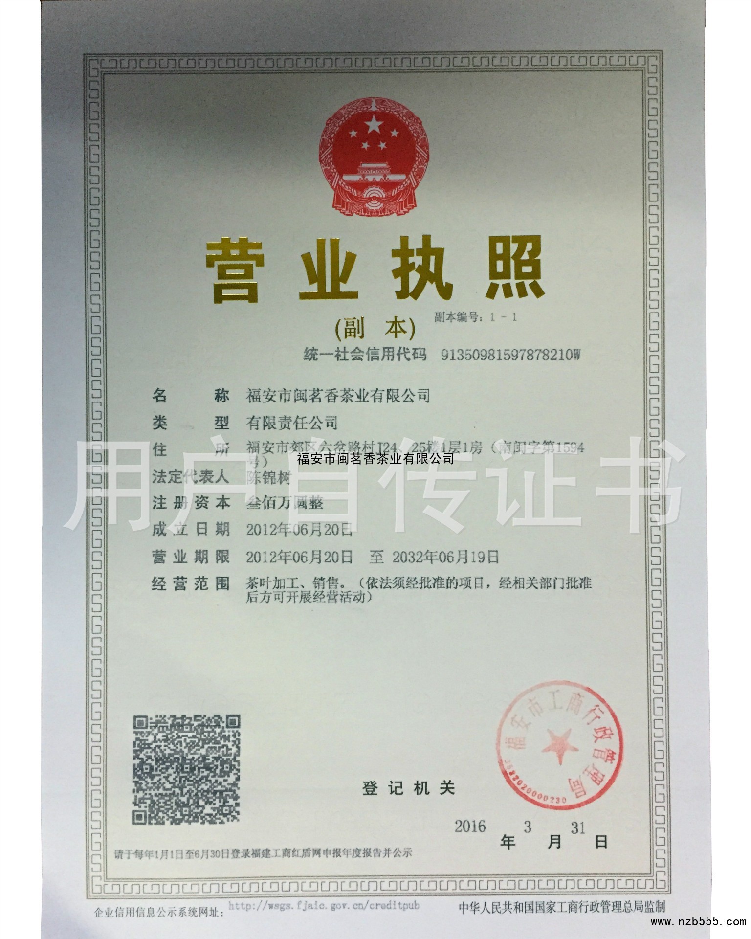 | 發(fā)證機(jī)構(gòu): | 福安市工商行政管理局 | 發(fā)證時(shí)間 : | 2016-03-31 |