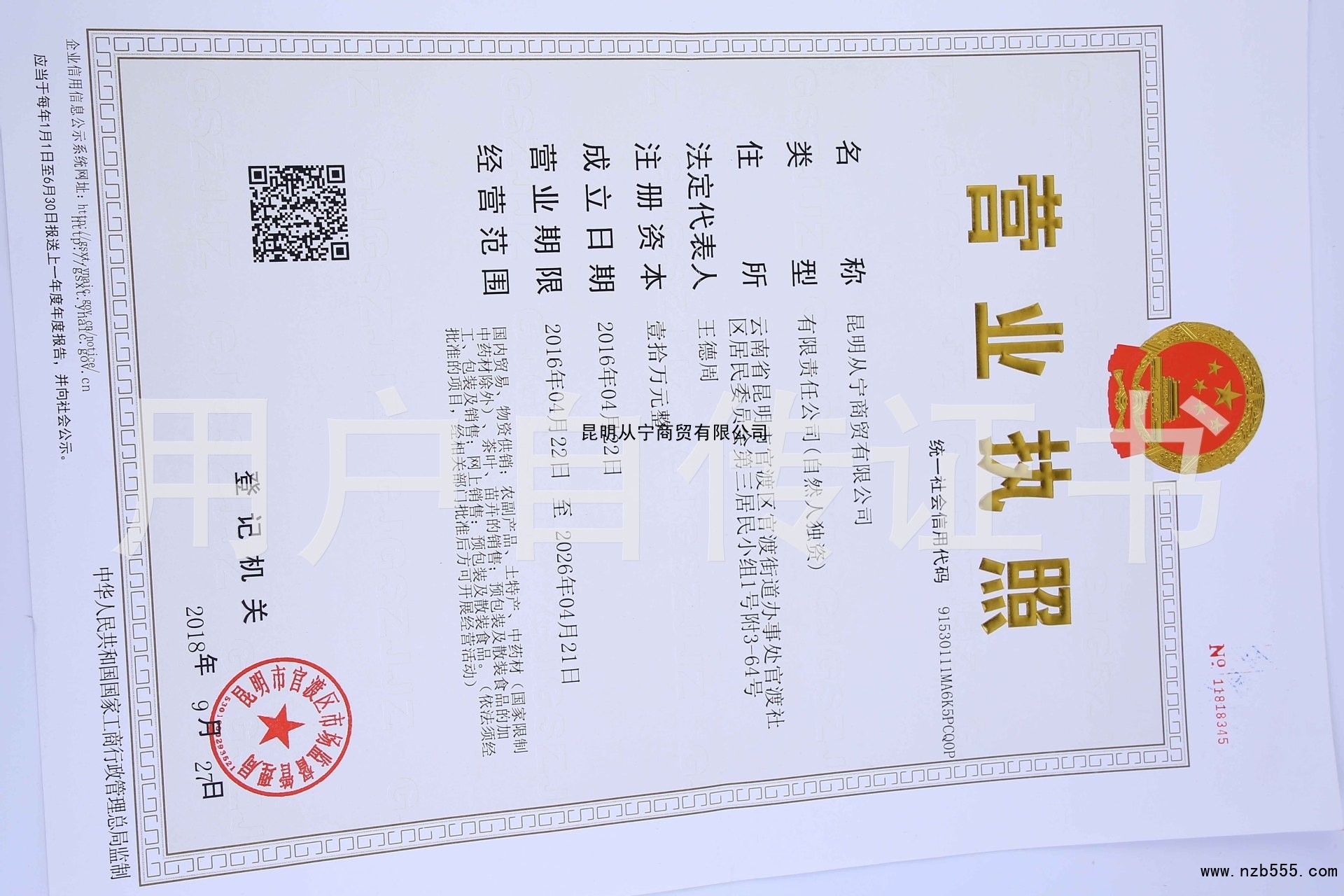 | 發(fā)證機(jī)構(gòu): | 昆明市官渡區(qū)市場監(jiān)督管理局 | 發(fā)證時(shí)間 : | 2018-09-27 |
