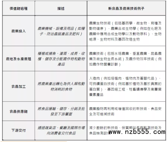 其中新食品及農業技術包括五大類: