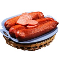配料表:雞肉,豬肉,水,淀粉,食用鹽,鮮蒜,白砂糖,天然香辛料,大豆蛋白,豬腸衣